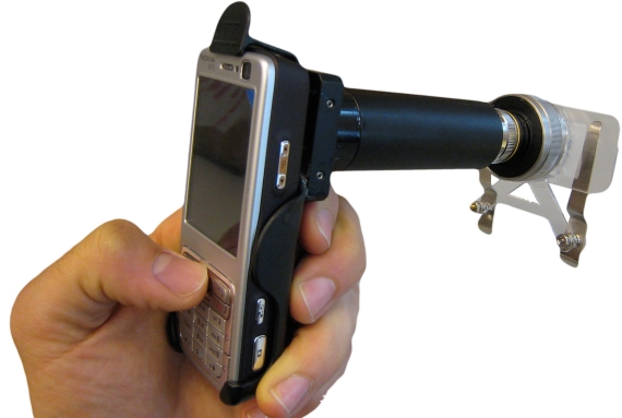 Usando accesorios más elaborados abre un nuevo campo de microscopía médica móvil, donde el ejemplo pionero es CellScope del laboratorio de Fletcher en la Universidad de Berkeley. En la figura 5, el CellScope utiliza un tubo con una óptica económica (precio del objetivo: menos de $100) que se coloca sobre la lente de la cámara del teléfono y lo convierte en un microscopio de alta calidad. Las imagenes (Figura 6) son suficiente para diagnosticar la malaria o el anemia de las células falciformes. Con el software de reconocimiento de imagen que se le instala el telefono, el sistema puede contar bacterias de la tuberculosis en muestras.